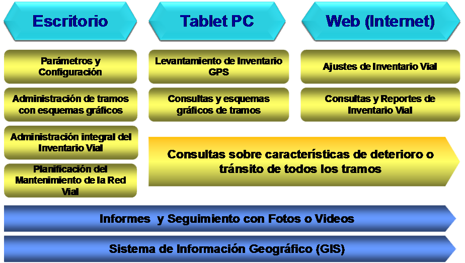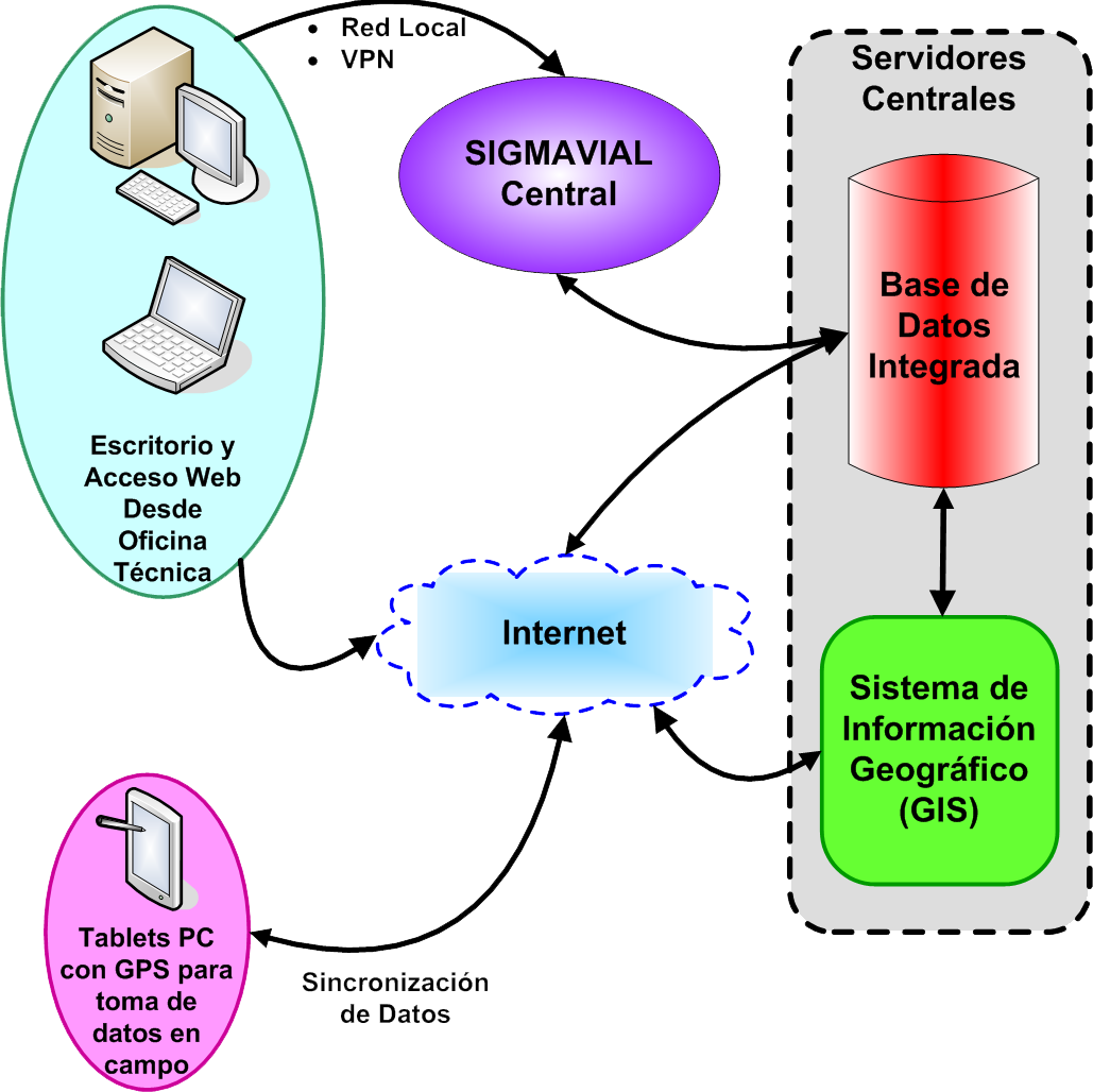 Arquitectura TecnológicaEl siguiente diagrama muestra una visión general de la arquitectura técnica del funcionamiento de todas las plataformas del SIGMAVIAL y su interacción con la Base de Datos Central del mismo como del Sistema de Información Geográfico. Está implementada en tres plataformas que trabajan de manera integrada con una base de datos en línea única.