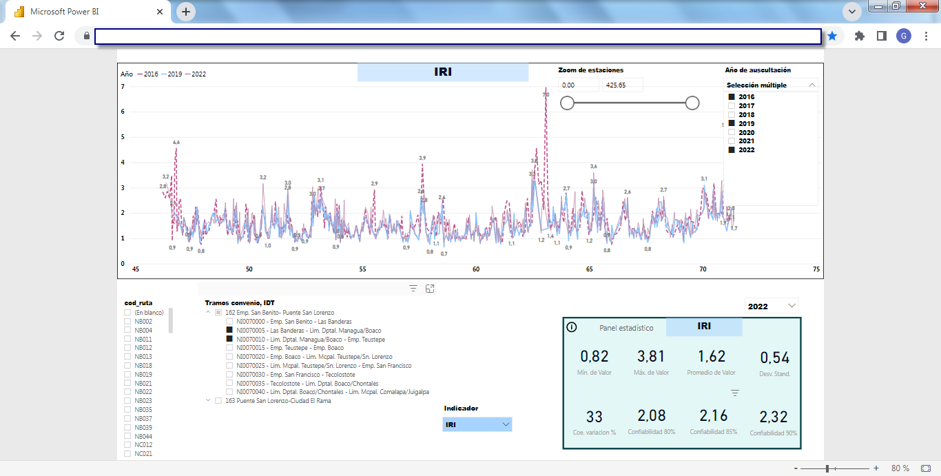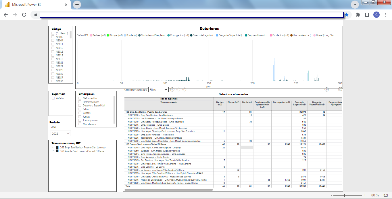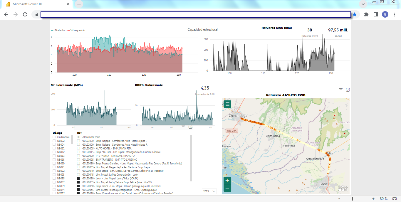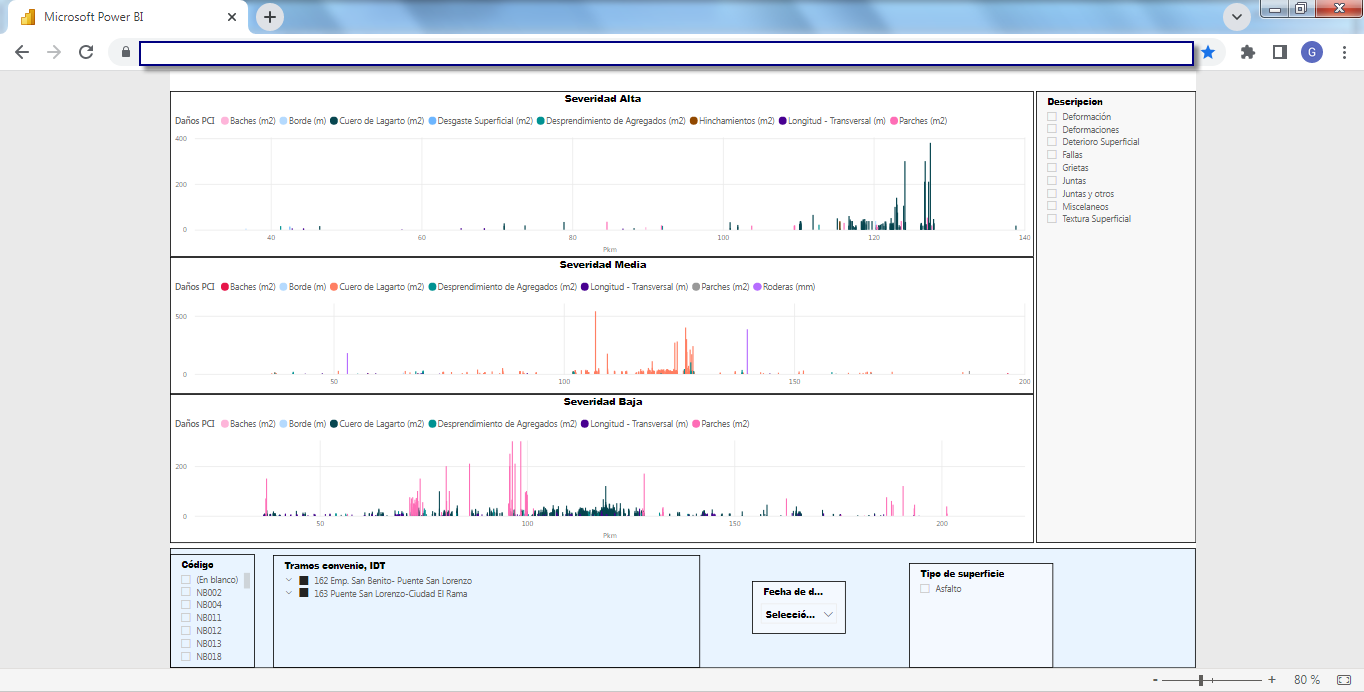 Business Intelligence (BI)La solución incluye un set de herramientas de Business Intelligence (BI) completamente integrado y "en línea" a la base de datos del SIGMAVIAL como a su Sistema de Información Geográfica, en plataforma WEB totalmente accesible por un navegador desde cualquier dispositivo ya sea de escritorio o móvil (tablet, celulares, etc.) que brinda informes y reportes dinámicos multicriterios generando un visualizador de información sumamente potente y como proyecciones estadísticas por medio del motor BI que utiliza Microsoft Power BI de integración con todos los componentes del SIGMAVIAL. Las siguientes capturas de pantalla muestran dos ejemplos (inventario e indicadores de deterioro de calzadas) de esta funcionalidad aplicada a la misma red vial: Business Intelligence (BI) aplicada a Inventario Vial![]() ![]() ![]() ![]() Business Intelligence (BI) aplicada a Indicadores de Deterioro de Calzada![]() ![]() ![]() ![]() ![]() | Quiénes Somos?