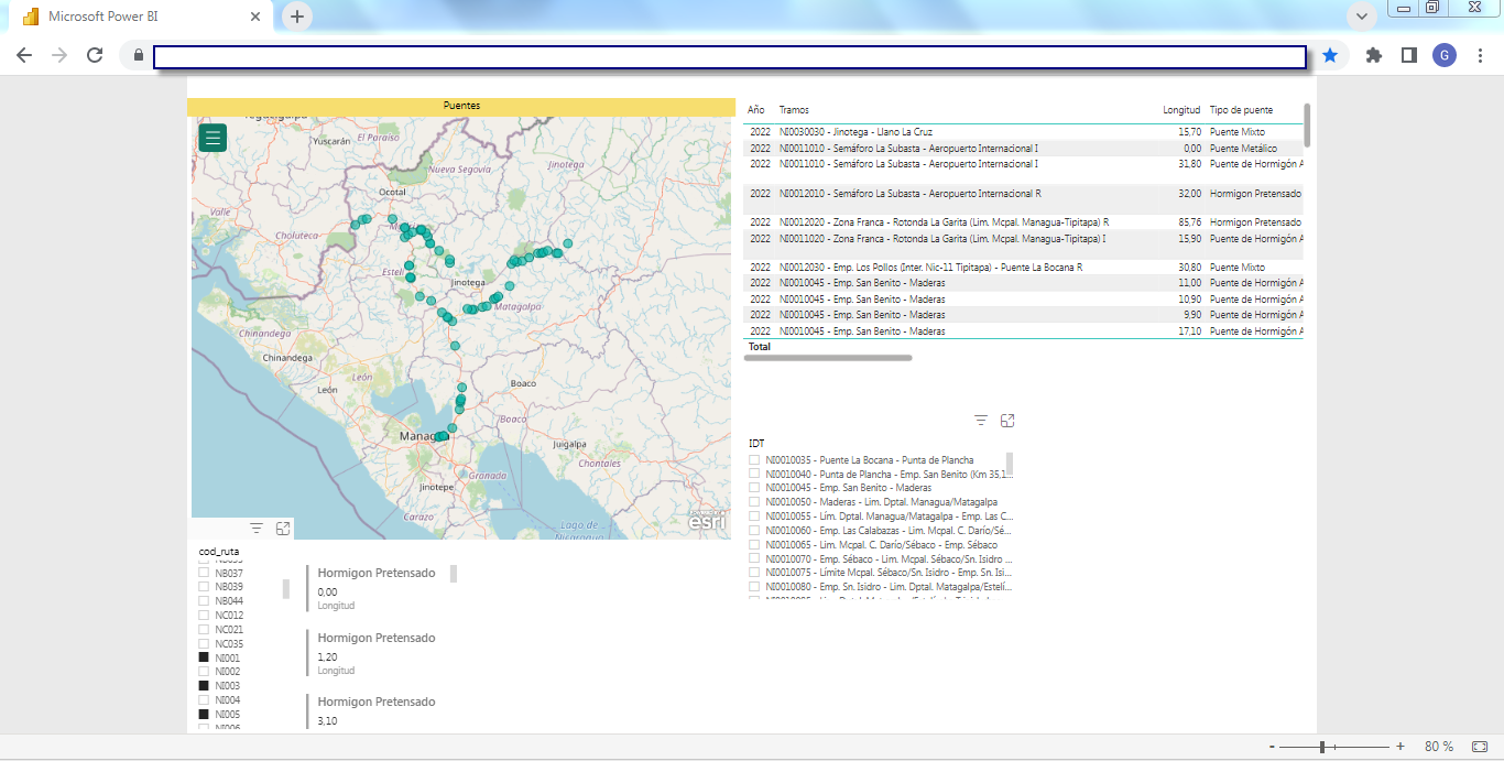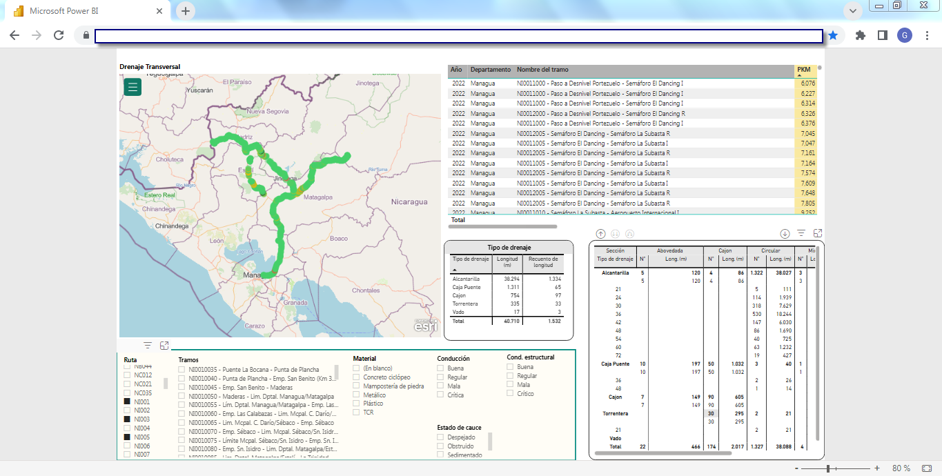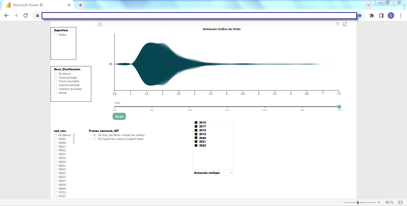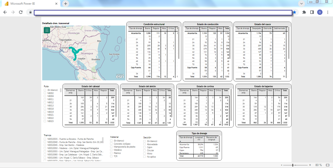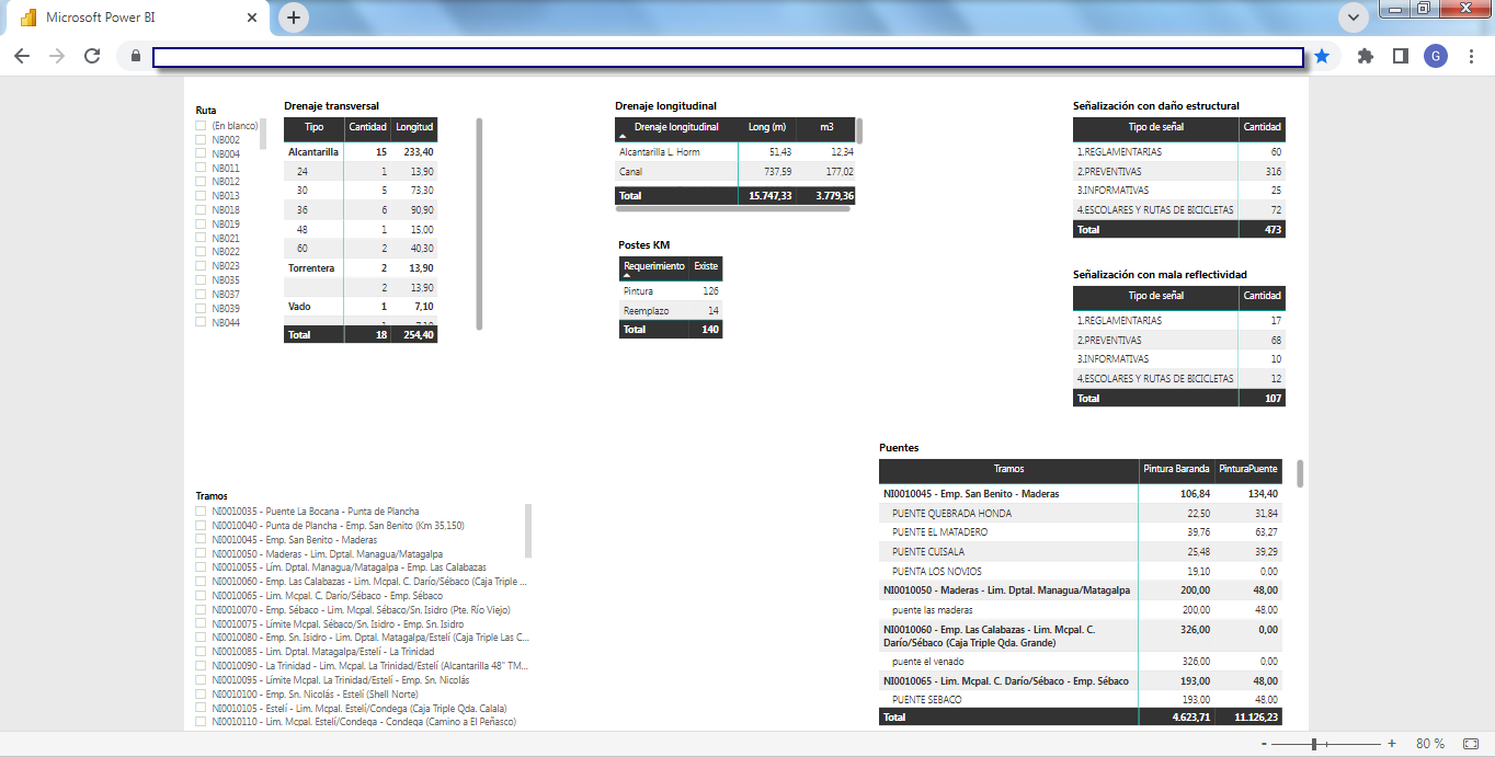 Business Intelligence (BI)La solución incluye un set de herramientas de Business Intelligence (BI) completamente integrado y "en línea" a la base de datos del SIGMAVIAL como a su Sistema de Información Geográfica, en plataforma WEB totalmente accesible por un navegador desde cualquier dispositivo ya sea de escritorio o móvil (tablet, celulares, etc.) que brinda informes y reportes dinámicos multicriterios generando un visualizador de información sumamente potente y como proyecciones estadísticas por medio del motor BI que utiliza Microsoft Power BI de integración con todos los componentes del SIGMAVIAL. Las siguientes capturas de pantalla muestran dos ejemplos (inventario e indicadores de deterioro de calzadas) de esta funcionalidad aplicada a la misma red vial: Business Intelligence (BI) aplicada a Inventario Vial![]() ![]() ![]() ![]() Business Intelligence (BI) aplicada a Indicadores de Deterioro de Calzada![]() ![]() ![]() ![]() ![]() | Quiénes Somos?