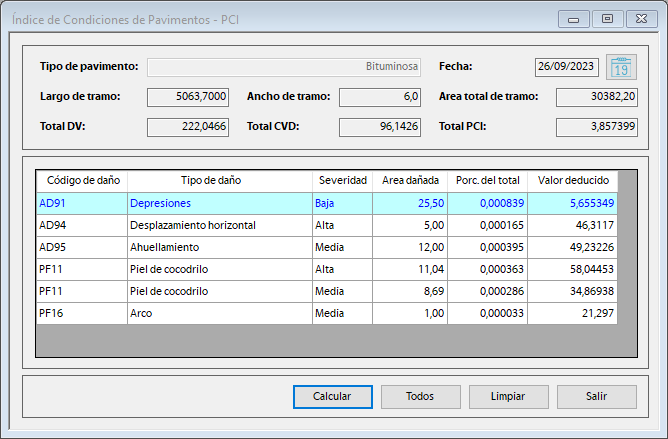 El cálculo del PCI se fundamenta en los resultados del inventario visual de la condición del pavimento realizado en campo con el SIGMAVIAL para dispositivos móviles en el cual se establecen clase, severidad y dimensión de cada daño relevado. El PCI se desarrolló para obtener un índice de la integridad estructural del pavimento y de la condición operacional de la superficie. Al seleccionar un tramo en la zona de tramos y esta opción aparecerá la siguiente pantalla: