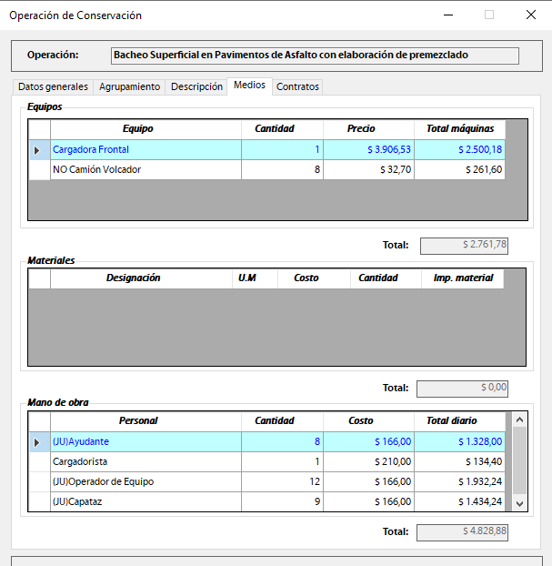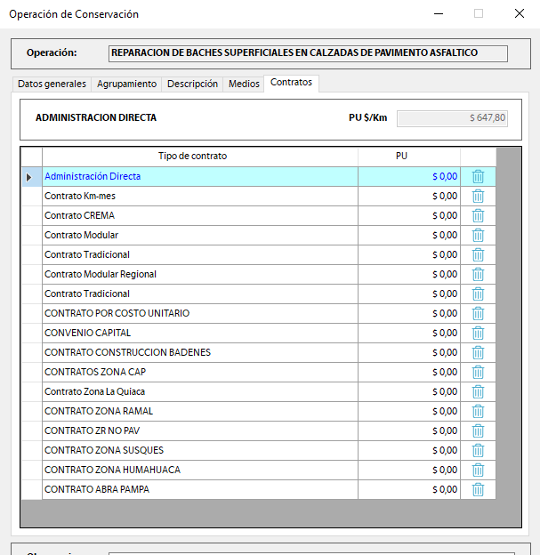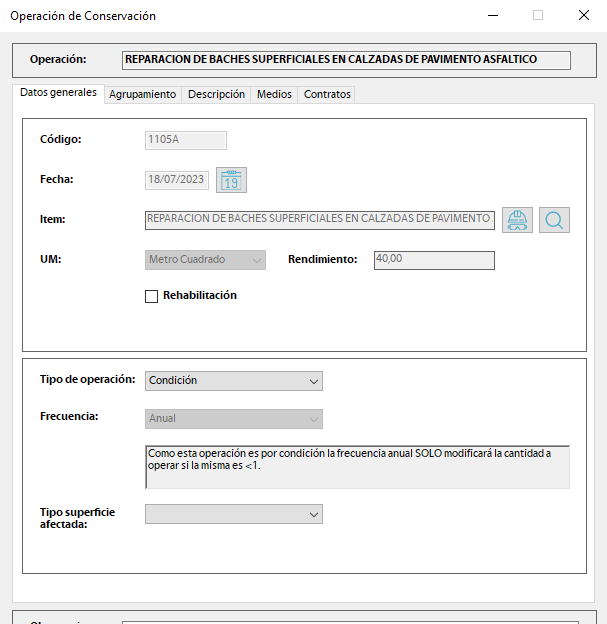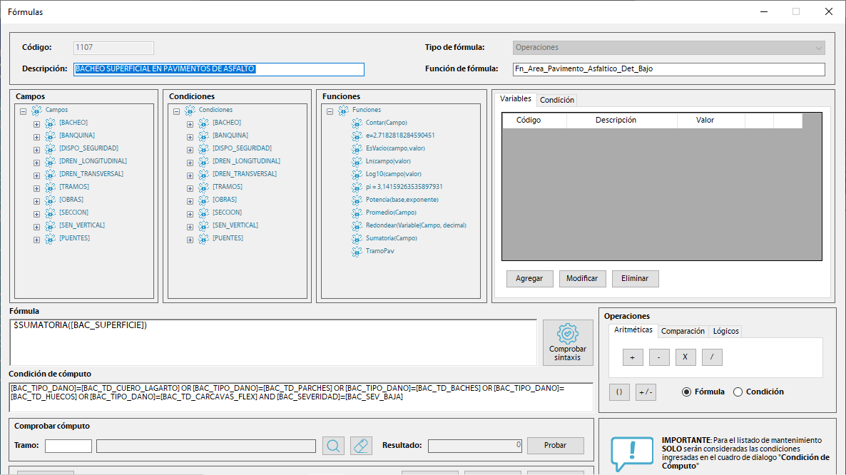 El objetivo de esta pantalla es gestionar las altas, y modificaciones de las operaciones. En la misma se observa una grilla que permite identificar las operaciones ordenando las mismas por diferentes criterios. Estos criterios se eligen a través de las opciones que se encuentran en la parte superior de la pantalla indicada con el rótulo “Ordenar”. En la siguiente imagen se observa la pantalla de administración de una actividad de mantenimiento en particular con todas sus solapas secuencialmente: ![]() ![]() ![]() ![]() ![]() La definición de las operaciones de conservación es central para la planificación, ya que a través de ellas es posible definir los costos específicos en términos de los recursos utilizados para cada operación. Cada operación tiene definida una unidad de medida y un rendimiento diario en término de cantidad de unidades por día, por lo tanto estableciendo los recursos diarios a insumir es posible calcular los costos unitarios. En la solapa de "Medios" de la imágen anterior se realiza la carga de recursos o medios que insume dicha operación o actividad de mantenimiento, es decir se indica la cantidad de horas de máquina, horas hombre y cantidad de materiales a insumir por la operación. De esta manera, para poder calcular los costos de mantenimiento de un tramo dado de la red solo será necesario establecer la cantidad de unidades de cada operación u actividad de mantenimiento que se requieren para ese tramo. Esta tarea la realiza SIGMAVIAL de manera automática en base a fórmulas de métricas y condición que puede definir el usuario. Es decir que el SIGMAVIAL puede calcular la cantidad de unidades de una operación en función de datos de estado de los elementos de inventario o la calzada, por ejemplo, la cantidad de m2 de bacheo es calculada por el sistema en función de las dimensiones y severidad de los daños relevados en campo con el mismo SIGMAVIAL pero en su plataforma móvil. Esta es una de las principales fortalezas de SIGMAVIAL ya que el costeo de mantenimiento se realiza en base a datos específicos y concretos, obteniéndose así un presupuesto confiable y respaldado por datos de la realidad. En la siguiente imagen se observa la pantalla de definición de fórmulas para el cálculo de métricas de una operación, conocida también cómo "Fórmula de Intervención":