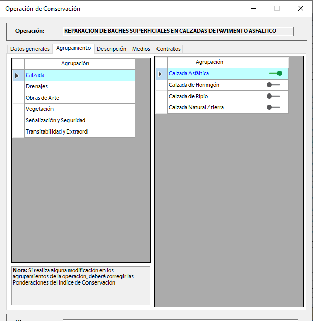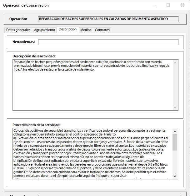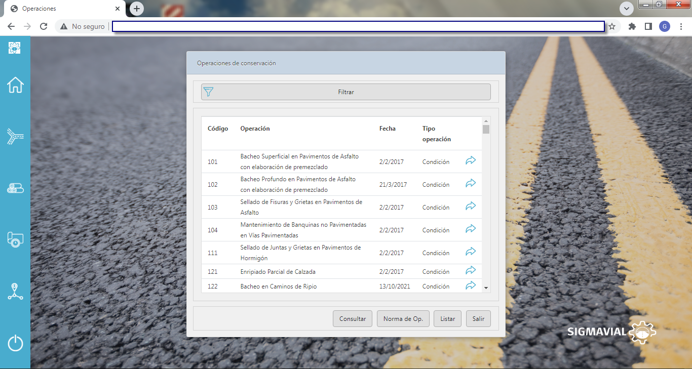 Actividades u Operaciones de Mantenimiento VialEsta funcionalidad permite a administración de las actividades u operaciones de conservación o mantenimiento vial tanto para elementos del inventario vial y calzada como de puentes (clasificadas a tal efecto) que se describen a continuación. Al acceder a la opción de operaciones se visualizarán todas las actividades de mantenimiento susceptibles de realizarse en la red administrada según la siguiente pantalla: En la versión Escritorio (Ver Video)