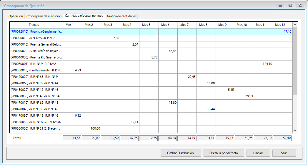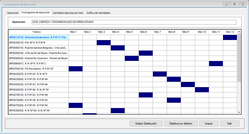 Cronogramas de MantenimientoSIGMAVIAL permite realizar la distribución en el año de cada una de las actividades de mantenimiento a realizar por tramo (Ver Video). Ello permite distribuir automáticamente la afectación de recursos en el año y por ende, permite saber en momento del año se requerirán las unidades físicas de cada recurso (mano de obra, equipamiento y materiales) y los fondos necesarios para poder obtenerlas de forma adecuada en tiempo y forma. Ello generará no sólo contar con el Presupuesto de Mantenimiento de toda la red sino también el Flujo de Fondos mensual completo del año como la asignación mensual de recursos a cada tarea específicamente a ejecutar, logrando la optimización completa de recursos físicos y financieros (presupuestarios). SIGMAVIAL permite realizar esta planificación de manera visual considerando la distribución planificada para ejecución de cada tarea o actividad de mantenimiento en el tiempo de acuerdo a la disponibilidad para cada tipo de equipamiento como se observa en la siguiente imagen: ![]() ![]() ![]() ![]() | Quiénes Somos?