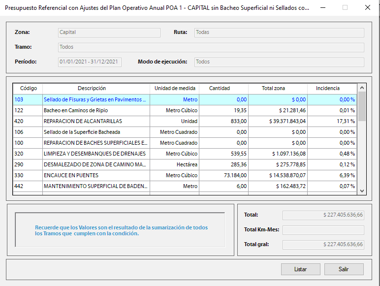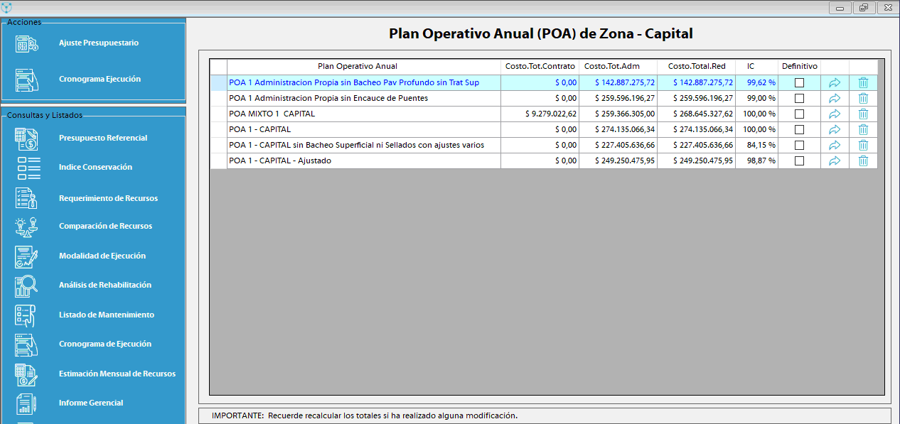 Plan Operativo Anual (POA)El SIGMAVIAL, gracias a las fórmulas de intervención y a la matriz de costos de cada operación o actividad de mantenimiento, calculará para cada tramo, para cada ruta, para cada zona y para el total de la red vial cuánto se requerirá realizar en unidades físicas de cada operación o actividad de mantenimiento, cuánto será su costo y cuáles sus recursos necesarios, a nivel físico y financiero. Ello lo realizará mediante mediante la ejecución del Plan Operativo Anual (POA) (Ver Video), a nivel físico y financiero (presupuesto), que calculará mediante algoritmos propios de cálculo como los creados por los usuarios.