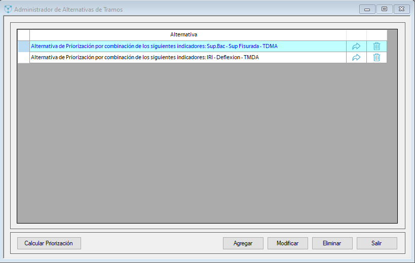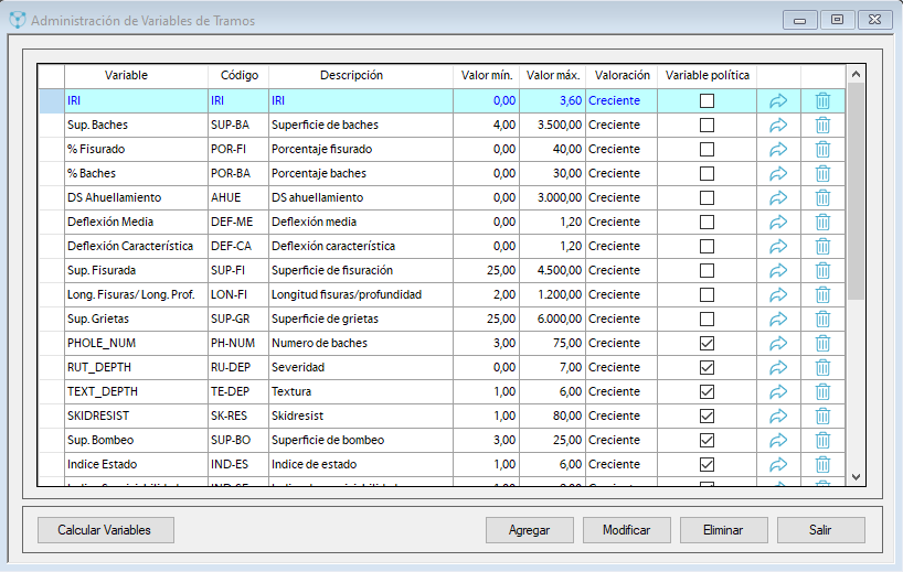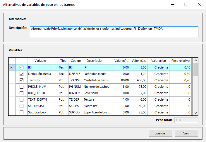 Priorización de Atención en Tramos y PuentesEl SIGMAVIAL cuenta con una herramienta de priorización tanto para atención de mantenimiento para tramos (Ver Video) como para puentes. La herramienta es similar para ambos casos, sólo diferenciándose en las variables que deben ser tenidas en cuenta para las dos priorizaciones (una aplicada a tramos de carreteras y la otra aplicada a puentes). Veamos el caso de tramos dado que el caso de puentes es muy similar pero sólo cambiando las variables. El SIGMAVIAL, a partir de las variables establecidas (que podrán ser técnicas - endógenas del mantenimiento vial, como ser: IRI, deflexión. ahuellamiento, etc. - o bien exógenas - que no dependen de los criterios del mantenimiento vial, como pueden ser: población abastecida, producción, clima, etc. -) , permite crear infinitas combinaciones de ecuaciones de priorización de acuerdo a los criterios a ser tenidos en cuenta por el planificador. Luego de elegida la ecuación de priorización deseada aplicará la priorización con ecuación o alternativa elegida para priorizar la atención de mantenimiento en tramos o puentes. Veamos un ejemplo a continuación sobre las variables establecidas para atención a los tramos, en la siguiente pantalla: