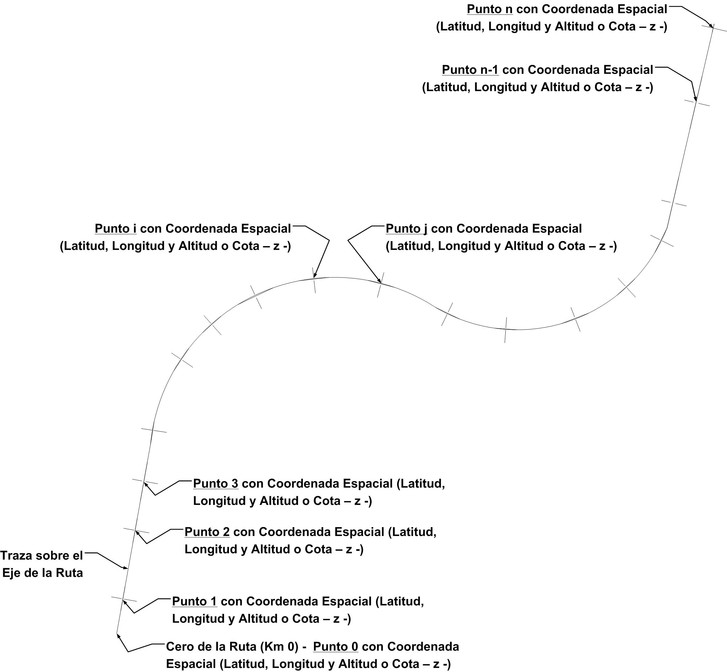 En el gráfico expuesto a continuación que se tomarán n puntos por ruta con una precisión dinámica submétrica (menos de 1 metro) de forma espacial (longitud, latitud y altitud o cota) con un vehículo en movimiento. La unión de los puntos tomados generará la traza de ruta desde el Punto 0 (Cero de la Ruta) hasta el Punto n. En el siguiente gráfico se expone la secuencia de datos tomados dinámicamente con GPS para un ejemplo de traza de ruta genérica expuesta anteriormente.