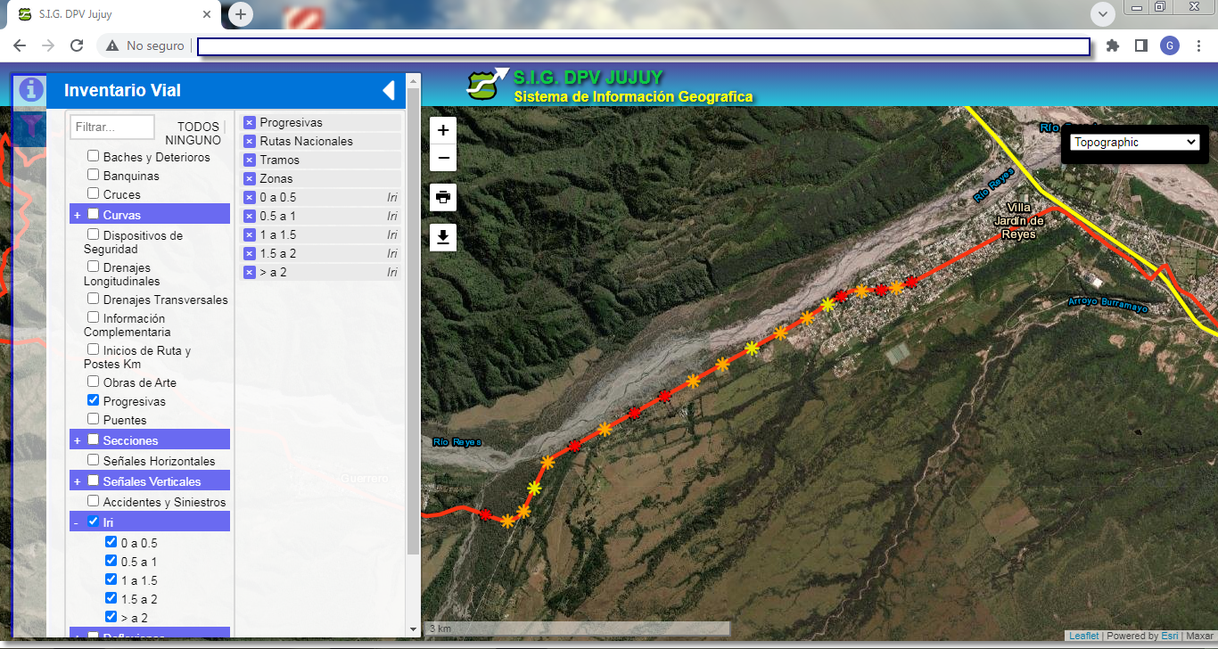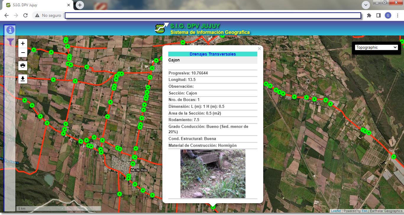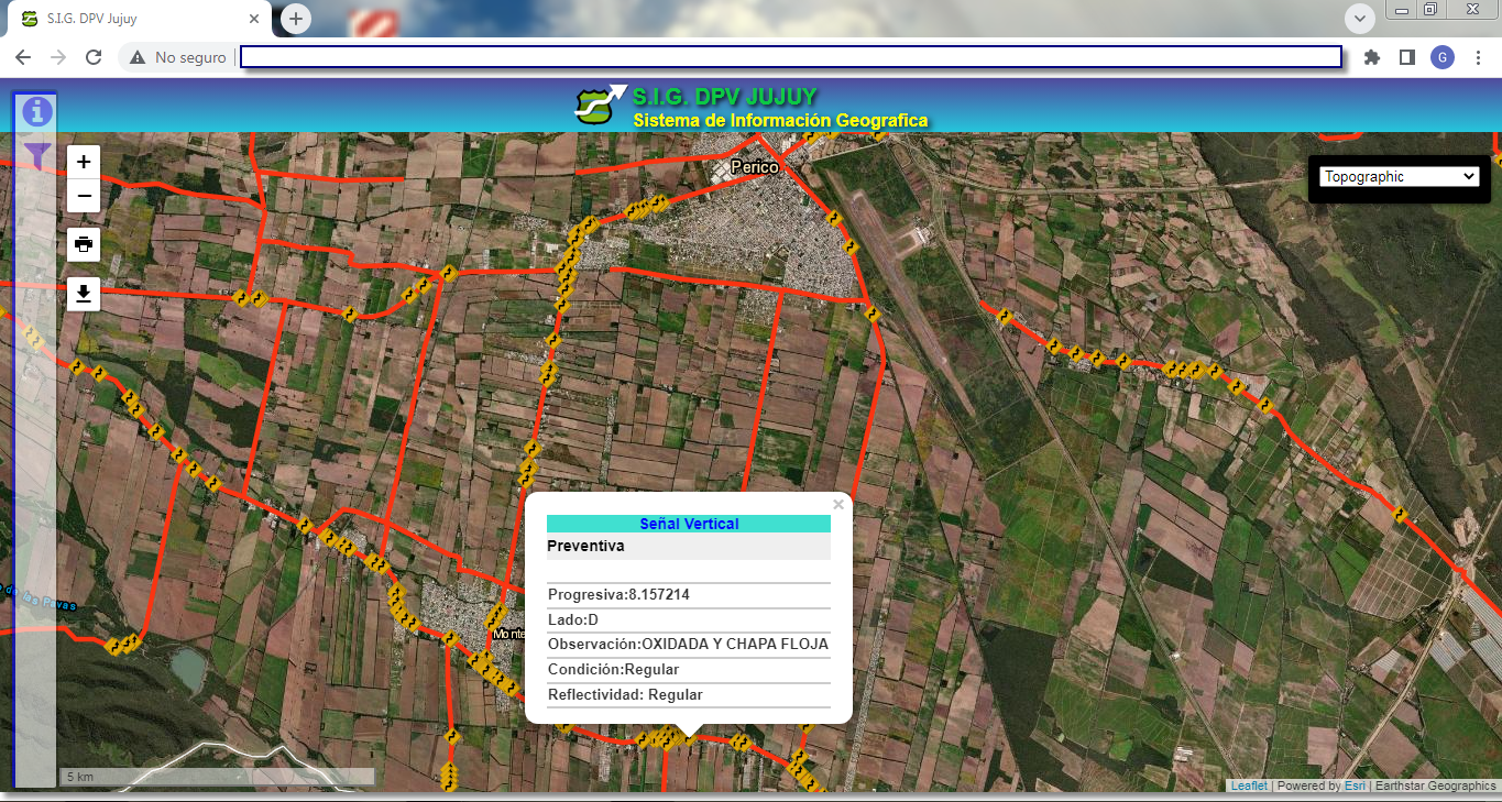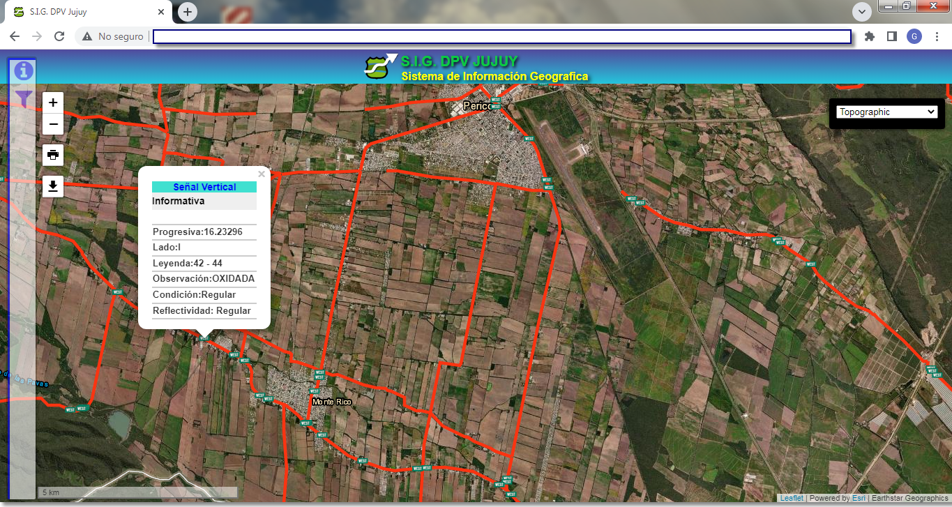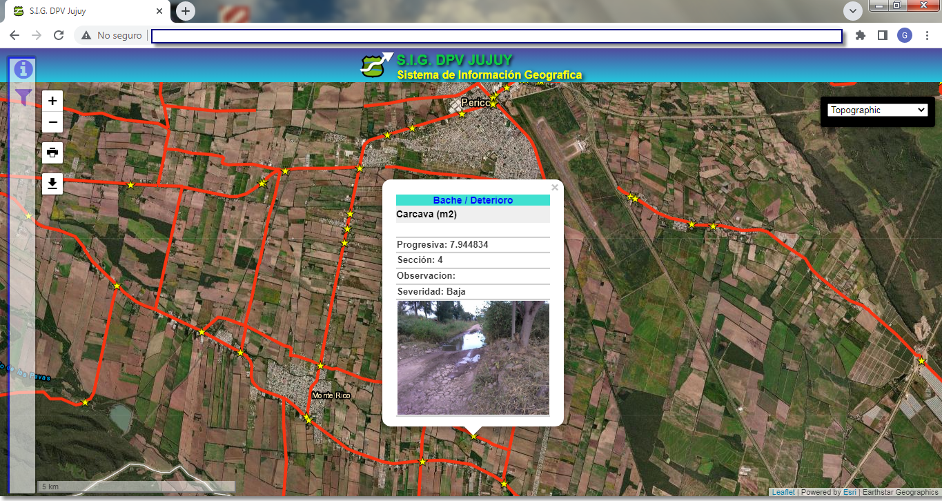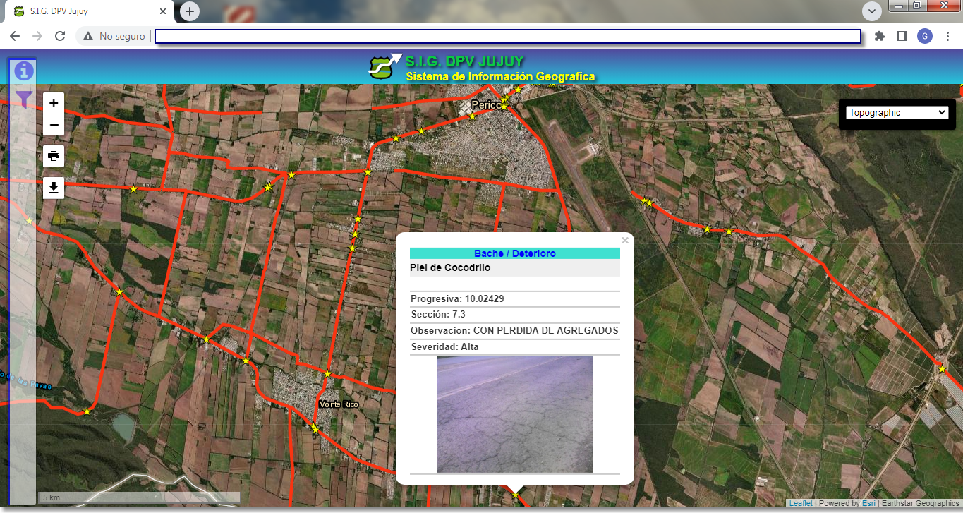 A continuación se expone un ejemplo de lo expuesto a hacer "click" con un mouse en la traza o eje georreferenciado de la carretera de ejemplo y se pueden observar la progresiva y la altitud calculada para cada punto en particular: ![]() ![]() ![]() ![]() ![]() ![]() ![]() El SIG del SIGMAVIAL es una herramienta totalmente accesible por un navegador WEB desde cualquier dispositivo ya sea de escritorio o móvil (tablet, celulares, etc.) que brinda información visual completa y actualizada totalmente georreferenciada con alta precisión. Las siguientes capturas de pantalla muestran algunos ejemplos de elementos de inventario vial (baches o deterioros de calzada, señales verticales, puentes y drenajes transversales) de esta funcionalidad aplicada a la misma red vial: ![]() ![]() ![]() ![]() ![]() ![]() ![]() ![]() | Quiénes Somos?