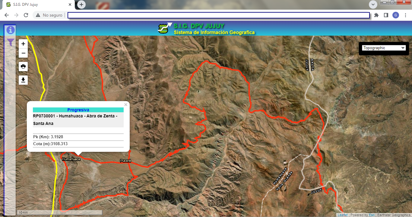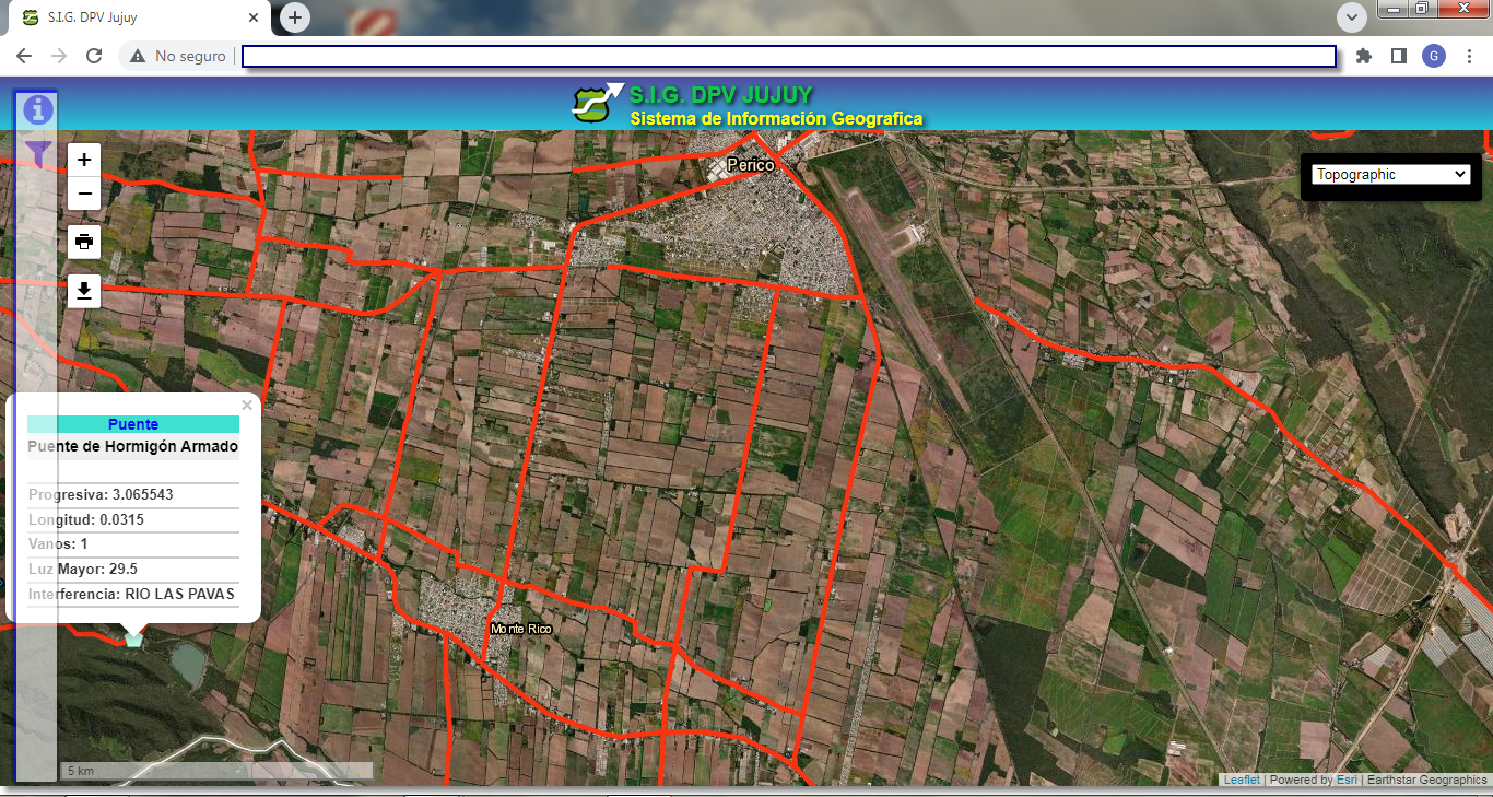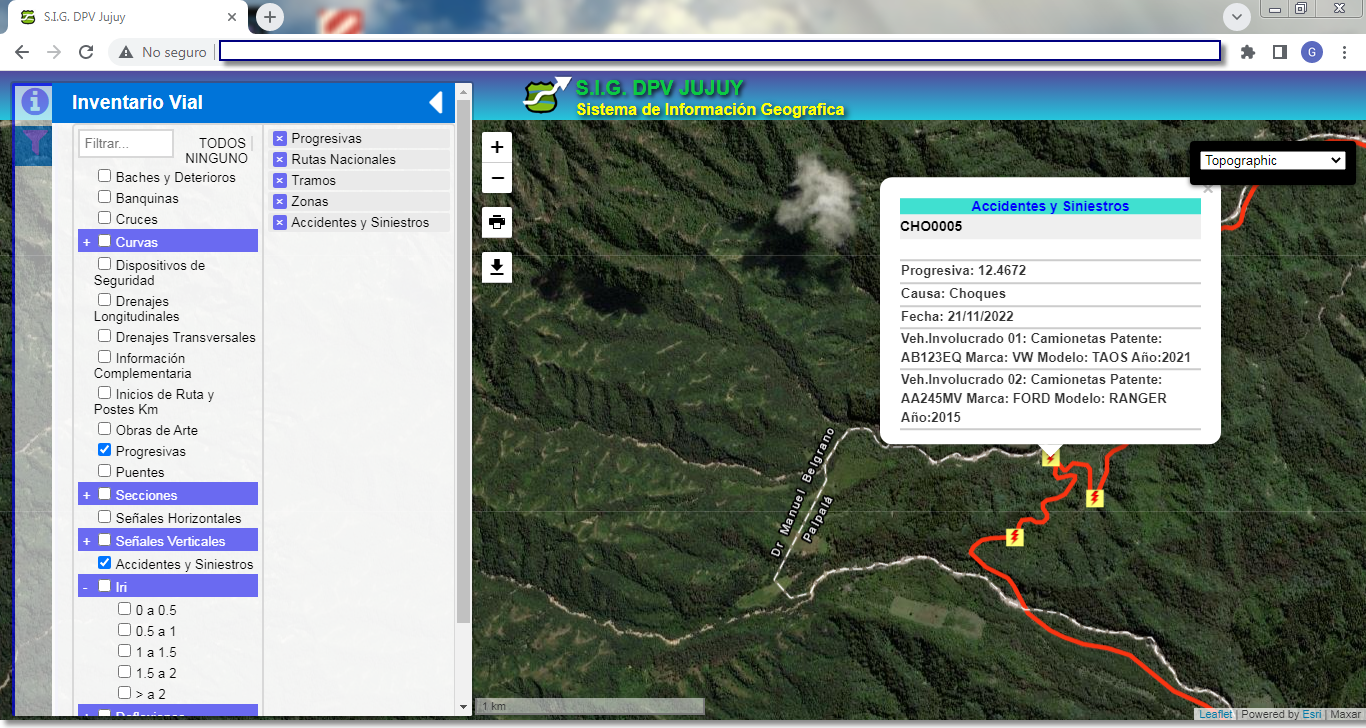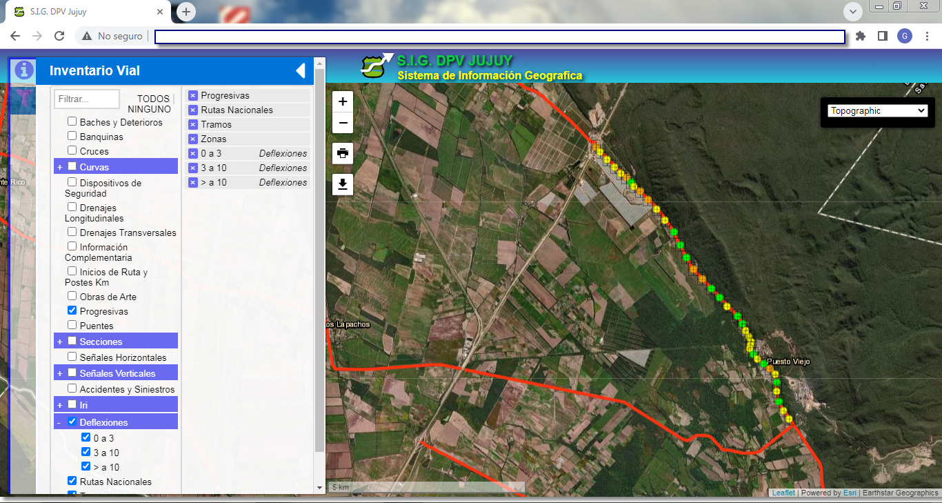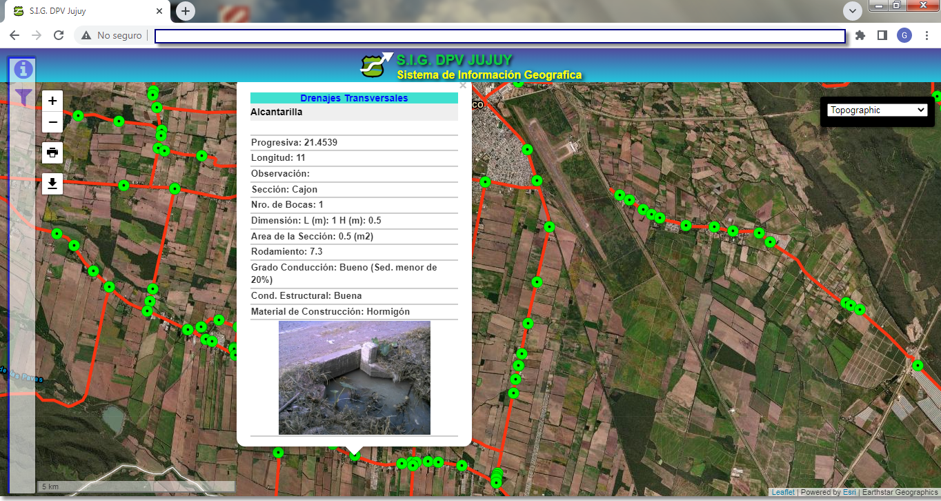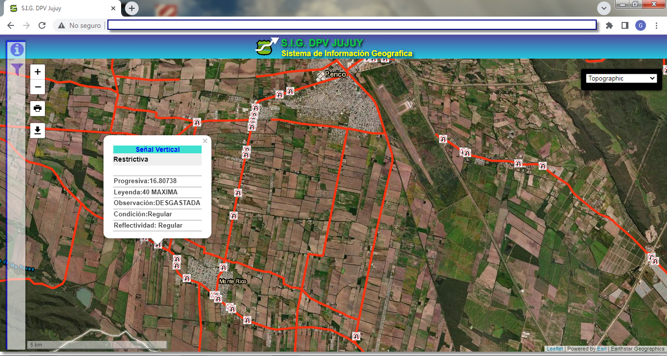 A continuación se expone un ejemplo de lo expuesto a hacer "click" con un mouse en la traza o eje georreferenciado de la carretera de ejemplo y se pueden observar la progresiva y la altitud calculada para cada punto en particular: ![]() ![]() ![]() ![]() ![]() ![]() ![]() El SIG del SIGMAVIAL es una herramienta totalmente accesible por un navegador WEB desde cualquier dispositivo ya sea de escritorio o móvil (tablet, celulares, etc.) que brinda información visual completa y actualizada totalmente georreferenciada con alta precisión. Las siguientes capturas de pantalla muestran algunos ejemplos de elementos de inventario vial (baches o deterioros de calzada, señales verticales, puentes y drenajes transversales) de esta funcionalidad aplicada a la misma red vial: ![]() ![]() ![]() ![]() ![]() ![]() ![]() ![]() | Quiénes Somos?