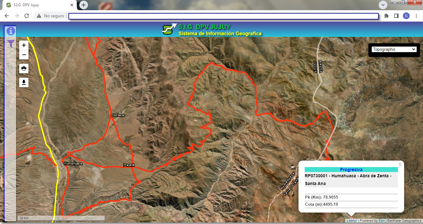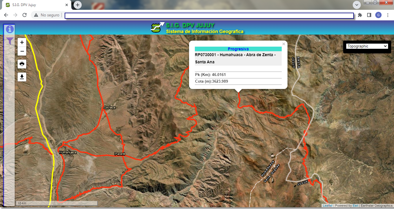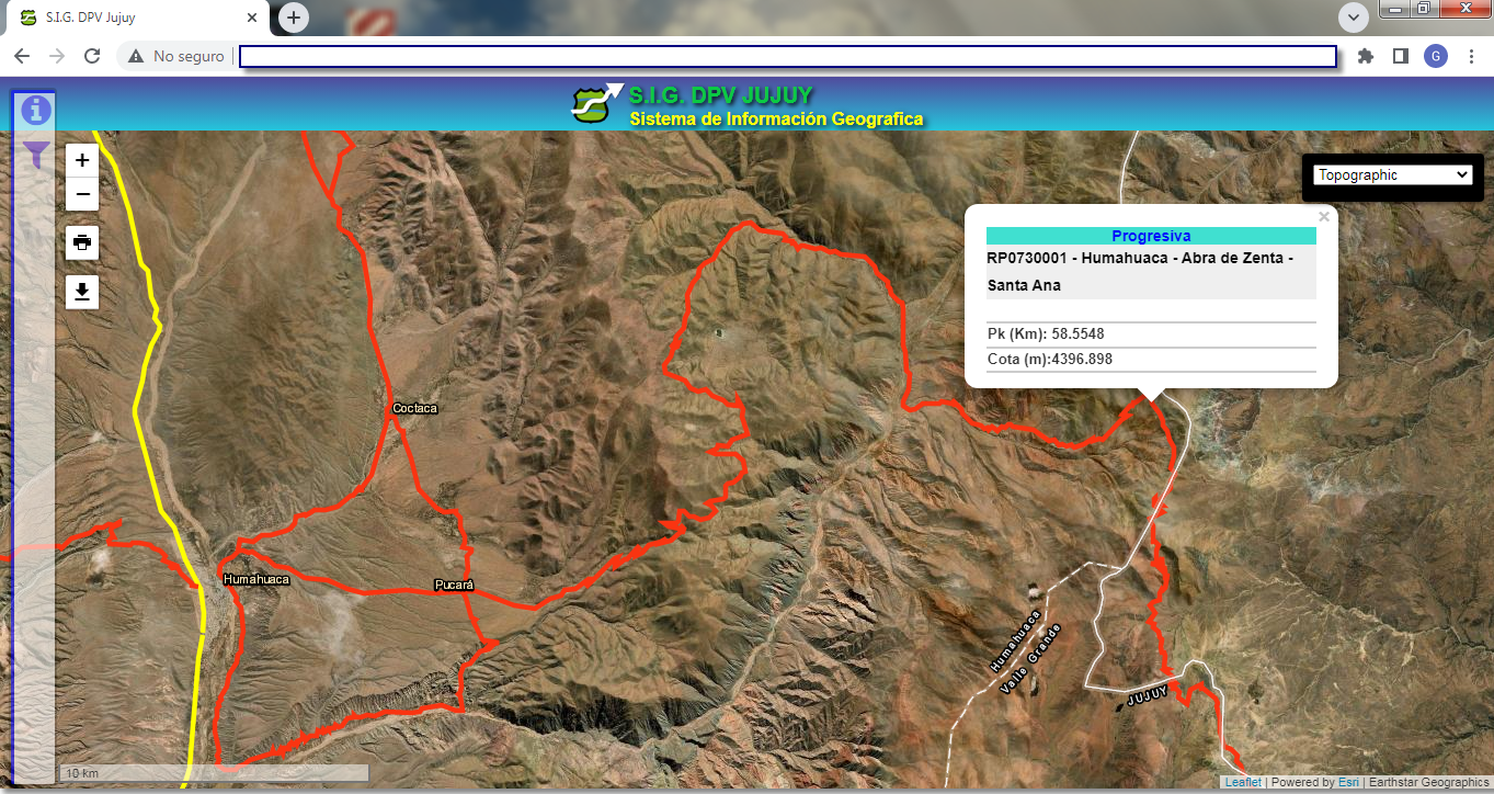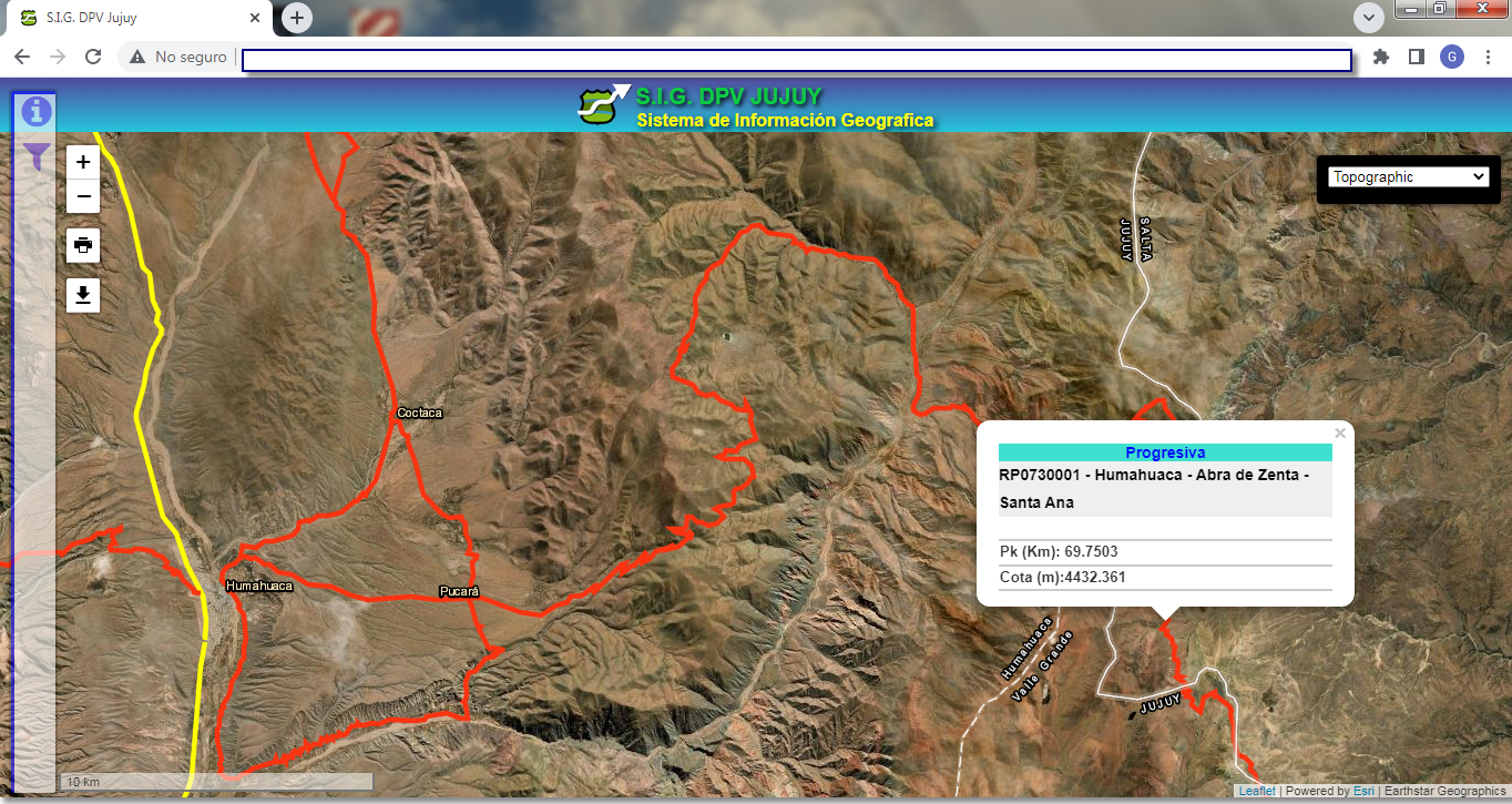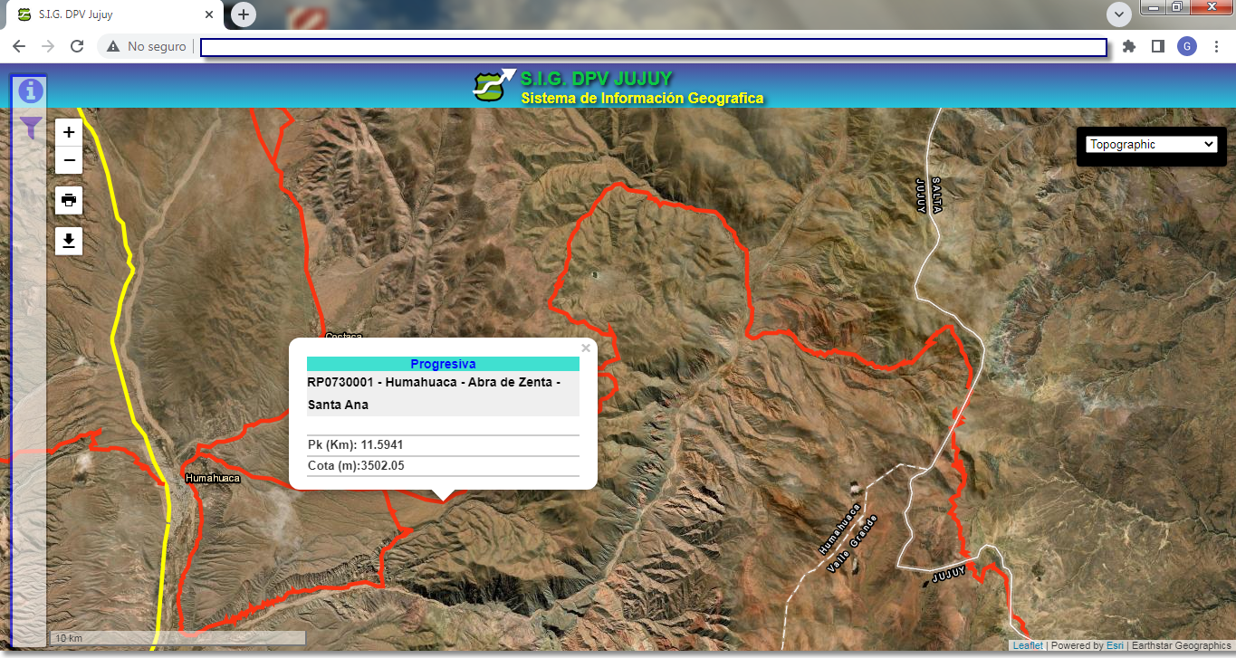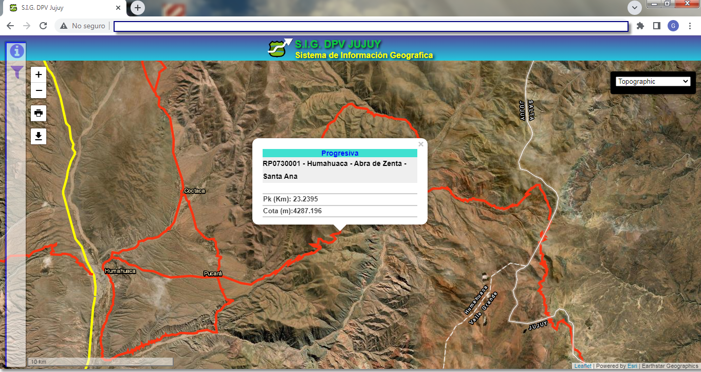 A continuación se expone un ejemplo de lo expuesto a hacer "click" con un mouse en la traza o eje georreferenciado de la carretera de ejemplo y se pueden observar la progresiva y la altitud calculada para cada punto en particular: ![]() ![]() ![]() ![]() ![]() ![]() ![]() El SIG del SIGMAVIAL es una herramienta totalmente accesible por un navegador WEB desde cualquier dispositivo ya sea de escritorio o móvil (tablet, celulares, etc.) que brinda información visual completa y actualizada totalmente georreferenciada con alta precisión. Las siguientes capturas de pantalla muestran algunos ejemplos de elementos de inventario vial (baches o deterioros de calzada, señales verticales, puentes y drenajes transversales) de esta funcionalidad aplicada a la misma red vial: ![]() ![]() ![]() ![]() ![]() ![]() ![]() ![]() | Quiénes Somos?