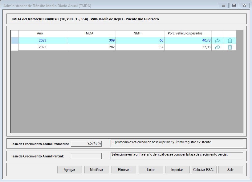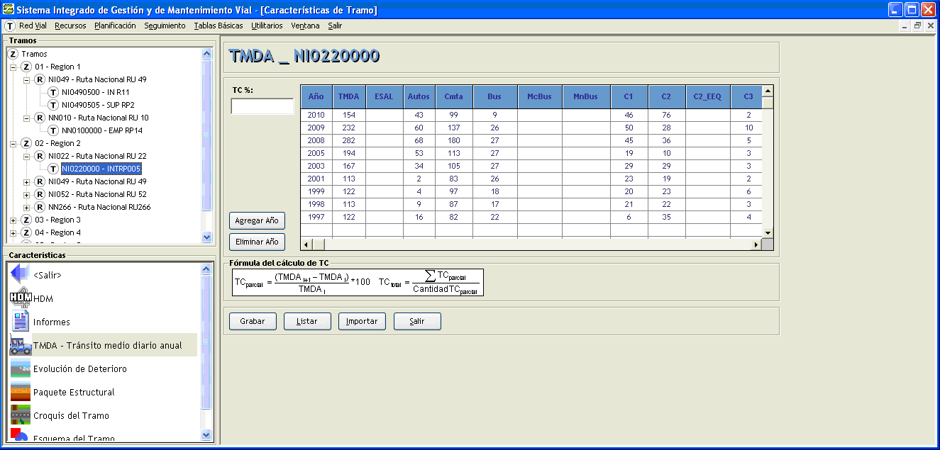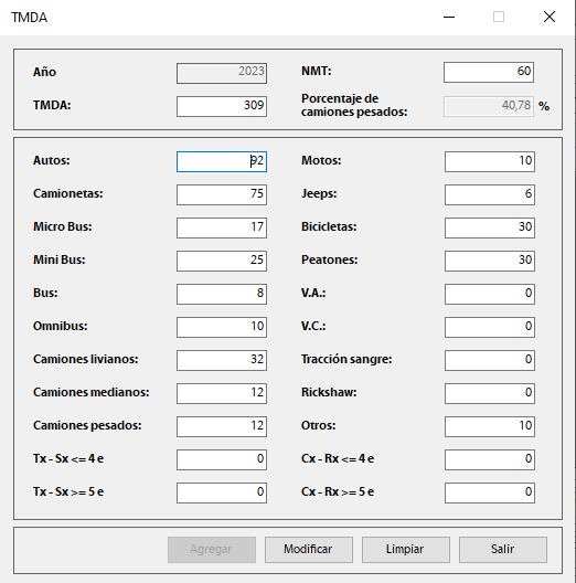 El SIGMAVIAL solicita la carga de estas estadísticas de tránsito para cada tramo para las siguientes categorías de forma anual de forma de poder calcular el TMDA: