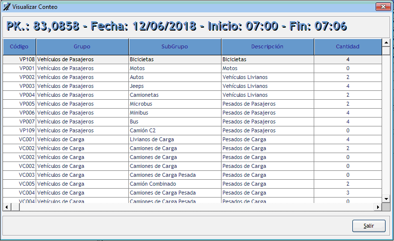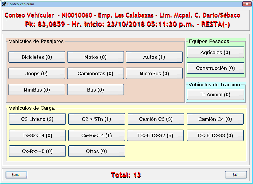 Estas componentes permitirán calcular año a año el TMDA y posteriormente su tasa de crecimiento promedio entre períodos anuales. Se desarrollaron interfases con distintos tipos de contadores de tránsito para la toma directa de datos desde los mismos. Aplicación móvil de Conteo VehicularEl SIGMAVIAL móvil cuenta con un dispositivo de conteo vehícular manual para hacer con el dispositivo móvil que se desee (preferentemente Tablet por el tamaño del tablero), esta toma de datos se encuentra totalmente georreferenciada de forma automática para evitar adulteraciones en la toma de datos. Esta aplicación ha sido y es de mucha utilidad para un lugar de difícil instalación de un medidor de tránsito o bien si se desea hacer una medición rápida del tránsito.